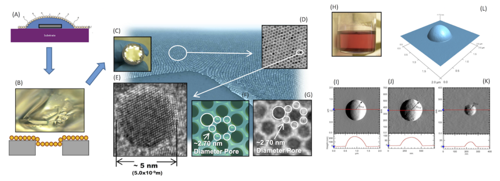 Optimial viewing for the above image is on a 21 inch wide screen. This figure is a collage of images that make up the different facets of my research interests. (A-C) This series of images depicts how self-assembled gold NP membranes are formed and how they are made to cover the openings of a porous substrate. The porous substrate is represented by the grey disk in figure (A), which is completely immersed in ultra-high purity water shown in blue. The ~5 nm diameter gold NPs, which are distributed in a water-insoluble organic solvent, are then deposited at the three phase contact line between the water, vapor, and solid. Self-assembly then occurs on the water interface as the solvent evaporates. The NP monolayer than slowly deposits itself onto the porous substrate as the water evaporates. (B) Shows a ~ 100 x magnification optical image of the NP membrane as the water slowly evaporates. Eventually, the membranes recede into the pores as the sample completely dries. (C) Shows the finished product prior to assembly in a filter housing. (D, E, G, and the blue background image) Show Transmission Electron Microscopy (TEM) images of the gold NPs at different magnifications. Collaborators at the University of Chicago took the high-resolution TEM image (E), while I took the other images at Argonne National Laboratory. (F) Shows a top view of a 3D rendered model, demonstrating that a ~ 2.7 nm diameter pore potentially exists between the gold core NPs; (G) shows that this 2.7 nm pore is in good agreement with experimental results. (H) Is a picture of what the gold NP solution looks like prior to depositing a small amount at the three phase contact line. Images (I-L) move away from looking at NP membranes, but instead focuses on NPs at lquid-vapor interfaces. Images (I-L) show different Atomic Force Microscopy (AFM) images of NPs protruding from a frozen liquid interface. From the final equilibrium geometry of the particle at the liquid-vapor interface, which is captured in the AFM images, the line tension parameter of the system can be determined; the line tension parameter plays a role in the stability of particles at these types of interfaces.